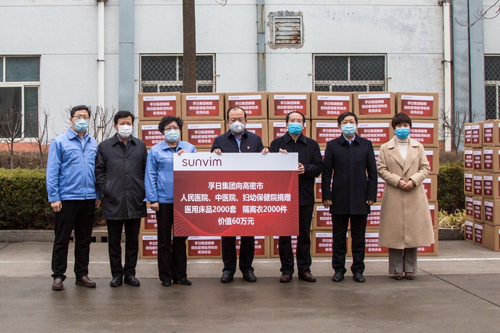 孚日集团统筹抓好企业自身的疫情防控与生产经营,并热心支持社会各界的防疫工作。新冠肺炎疫情期间,孚日集团向高密市慈善总会捐款人民币100万元专项资金用于疫情防控,向高密市人民医院、中医院、妇幼保健院定向捐赠总价值60万元的医用床品2000套、隔离衣2000件。